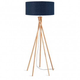 Posé sur 5 pieds torsadés en bambou, ce lampadaire de salon ou de salle à manger a un style tendance unique. Son abat-jour cylindrique est en lin bleu et on aime le contraste entre la couleur et le bambou naturel.