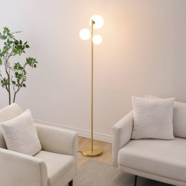 Melinda est un lampadaire tendance de 150 cm. Il se compose d'un pied couleur laiton et de trois abat-jours en verre blanc, le tout reposant sur un socle rond solide de 25 cm de diamètre. Melinda fonctionne via un interrupteur sur câble ON/OFF et doit être complété de trois ampoules de culot G9 (non fournies). Adoptez ce lampadaire moderne dans vos salons, bureaux ou chambres.