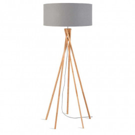 Voici un lampadaire de salon à l'abat-jour cylindre en lin gris qui pourrait aussi bien trouver sa place dans une entrée ou une chambre : classique par son coloris, ce lampadaire aux 5 pieds torsadés a pourtant une particularité étonnante, qui le rend unique... Il est en bambou !