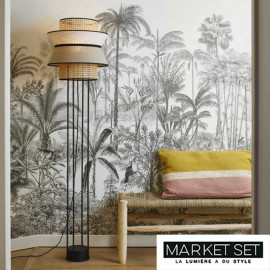 Ce lampadaire en cannage et tissu casse les codes avec son triple abat-jour bi matière et son pied métallique. Il parait être comme suspendu. l'abat-jour central est en cannage avec une bordure noire et sur la partie centrale vient se greffer un autre abat-jour en tissu bi-color gris anthracite et blanc borduré de noir.