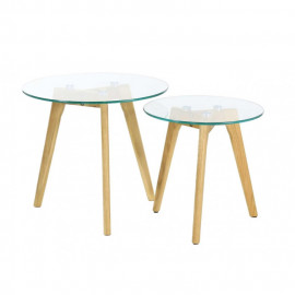 Description Lot de 2 Tables Gigognes "Trempé" 50cm Transparent Les tables gigognes ont le vent en poupe ! Découvrez ce Lot de 2 Tables Gigognes "Trempé" 50cm Transparent en bois agrémenté d'un plateau de forme ronde. Réalisé dans un verre trempé ultra-résistant et transparent, vous serez séduit par sa qualité et pourrez apporter un style moderne à votre intérieur tout en adaptant ces tables gigognes à vos besoins. Caractéristiques : Dimensions : Taille 1 : D. 50 x H. 43,5 cm Taille 2 : D. 40 x H. 40,5 cm Matières : Bois (Hevea) & Verre trempé Spécificités : Pratique & Utile Lot de 2 Tables Gigognes Forme Ronde 3 Pieds en Bois Notice de Montage incluse Facile d'entretien & d'utilisation Coloris : Transparent & Naturel *Prix moyen constaté sur des sites concurrents ou prix conseillé par le f