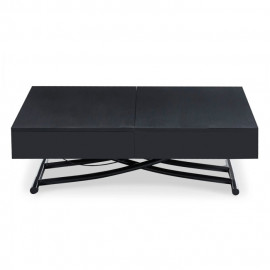 Description Table Basse Relevable "Lift" 120-190cm Noir Mat A la fois pratique et très tendance, cette Table Basse Relevable "Lift" 120-190cm Noir Mat s'intègrera à la perfection dans votre salon ou salle à manger : elle peut faire office de table basse et en rien de temps devenir une table de repas ! Vous pourrez facilement augmenter la hauteur de cette table en remontant ses pieds en métal effet satiné, très chics. Sa longueur est également très facilement ajustable grâce à ses 2 parties qui peuvent s'écarter l'une de l'autre, ce qui permet l'insertion de 2 rallonges. Une véritable table design tout-en-un qui saura vous séduire ! Caractéristiques : Dimensions : L. 120-155-190 x l. 80 x H. 40-75 cm Matières : MDF & Métal Spécificités : Design & Elegant Table basse relevable Plateau extens