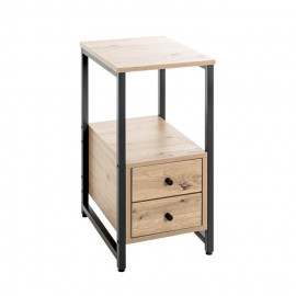 Description Table d'Appoint 2 Tiroirs "Miranda" 63cm Chêne & Noir La Table d'Appoint 2 Tiroirs "Miranda" 63cm Chêne & Noir est un meuble polyvalent et pratique. Elle est fabriquée avec un cadre en tube d'acier laqué noir, ce qui lui confère une allure moderne et robuste. Les plateaux de la table sont en panneaux de particules décor chêne, ce qui ajoute une touche chaleureuse et naturelle à son design. Elle est équipée de deux tiroirs, offrant un espace de rangement supplémentaire pour garder vos affaires organisées et à portée de main. Les tiroirs peuvent accueillir des objets tels que des télécommandes, des stylos, des clés ou d'autres petits accessoires. Caractéristiques : Dimensions : L. 30 x l. 40 x H. 63 cm Matières : Structure : Acier Plateau : Panneaux de particules Spécificités : P