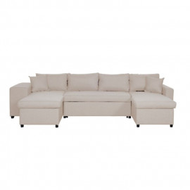 Description Canapé Panoramique Convertible "Coval II" 311cm Beige Faites-vous plaisir en choisissant ce beau Canapé Panoramique Convertible "Coval II" 311cm Beige qui vous accompagnera durant vos sessions relaxation et détente devant la télévision. Disponible en plusieurs coloris, à vous de choisir la nuance parfaite pour sublimer et mettre en valeur votre salon. Alors, qu'attendez-vous pour tester son confort dès maintenant ? Caractéristiques : Dimensions : L. 311 x l. 146 x H. 81 cm Assise : L. 260 x l. 54 x H. 44 cm Dossier : H. 37 cm Pieds : H. 5 cm Accoudoir : H. 58 cm Coussin : L. 35 x l. 35 cm Méridienne : L. 118 x l. 70 cm Pouf : L. 30 x l. 30 x H. 44 cm Coffre de Rangement : L. 140 x l. 60 x H. 26,5 cm Couchage : L. 136 x l. 260 cm Matières : Structure : Bois Massif, Panneaux de p