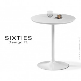Petite table ronde design sur pied central SIXTIES, piètement type trompette ou tulipe, base Ø50 cm, colonne tube d'acier Ø5 cm, peinture blanche RAL-9016, noir, finition satiné RAL-9005. Plateau MDF, épaisseur 2,5 cm, finition placage stratifié blanc ou noir avec chant incliné 45° sous. Dimensions : Ø60 ou Ø70 cm au choix.