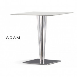 Table design pied central fantaisie ADAM, colonne en méthacrylate conique, platine de sol inox satiné ou inox poli, base 40x40 cm. Plateau Compact-HPL épaisseur 1 cm, dimensions 80x80 cm de couleur noir ou blanc. Chant plateau incliné sous à 45° - Lot de 6 tables.