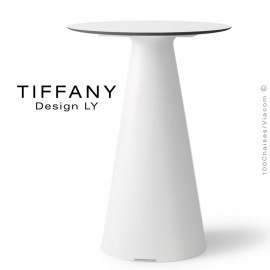 Table repas design TIFFANY, pour extérieur, café, hôtel, restaurant, CHR, piscine, pool house, SPA, bord de mer, plagiste (milieu salin), mais aussi pour la maison. Piétement colonne centrale plastique conique en polyéthylène, base 35x35 cm., hauteur 72 cm., option sur demande avec système de pieds réglables (mise à niveau). Plateau compact rond Ø60 / Ø70 / Ø80 cm., épaisseur 1 cm., avec chant inc