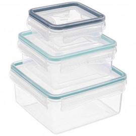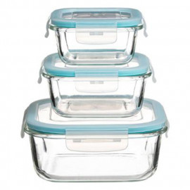 Description Lot de 3 Boîtes de Conservation Carrées "Clipeat" 18cm Bleu Pour une conservation optimale, craquez pour cet indispensable Lot de 3 Boîtes de Conservation Carrées "Clipeat" 18cm Bleu. Avec ces boîtes de conservation aux différentes dimensions, vous pourrez ranger l'ensemble de vos aliments en fonction de vos quantités et de leurs tailles. Dotés de clips ainsi que d'un couvercle hermétique, vous pourrez également conserver vos plats en sauce sans aucun souci ! De plus, étant emboîtables, vous n'aurez aucune difficulté à les ranger ! Caractéristiques : Dimensions : Boite 1 : 330 ml: L. 11,3 x l. 11,3 x H. 7,8 cm Boite 2 : 530 ml : L. 13,1 x l. 13,1 x H. 5,1 cm Boite 3 : 1180 ml : L. 17,6 x l. 17,6 x H. 6,7 cm Matières : Verre, Polypropylène & Silicone Spécificités : Haute résis