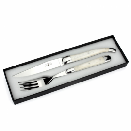 Set couteau et fourchette Forge de Laguiole Set composé de 2 pièces La Forge de Laguiole, mitre inox, finition brillante, manche en os blanc poli 1 couteau 1 fourchette Chaque pièce est intégralement unique et faite main du début à la fin par un seul artisan, il peut y avoir de légères différences...