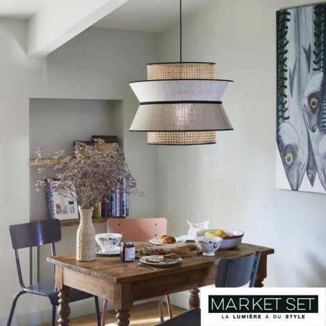 Découvrez cette grande suspension fabriquée en fibres naturelles !La suspension trois abat-jour XL est fabriquée en cannage et en lin de couleures nude. Elle apportera une jolie touche de douceur chaleureuse à votre intérieur.Ce luminaire légèrement ajouré avec son cannage, créera une lumière unique à votre pièce grâce aux jeux d'ombres. Une jolie a