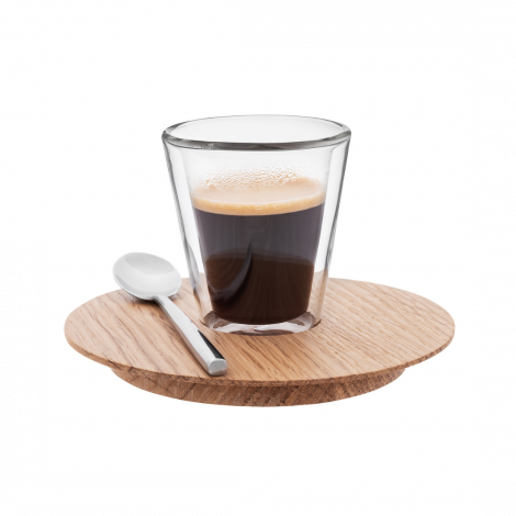 Tasse conique avec soucoupe en bois Set composé d'une tasse en verre double paroi, soucoupe en bois de chêne et cuillère élégante qui, grâce à des aimants, tient exactement là où la soucoupe en bois est aimantée. La soucoupe est traitée avec un mélange naturel de cires et d'huiles. Le café ne...